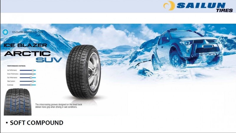 Шины для кроссоверов и внедорожников Sailun Ice Blazer Arctic SUV, унаследовавшие рисунок от Sailun WinterPro SW81, отличаются усиленными плечевинами с крупными блоками, призванными улучшить устойчивость в повороте. Доступны размеры от 215/65R16 до 255/55R18.